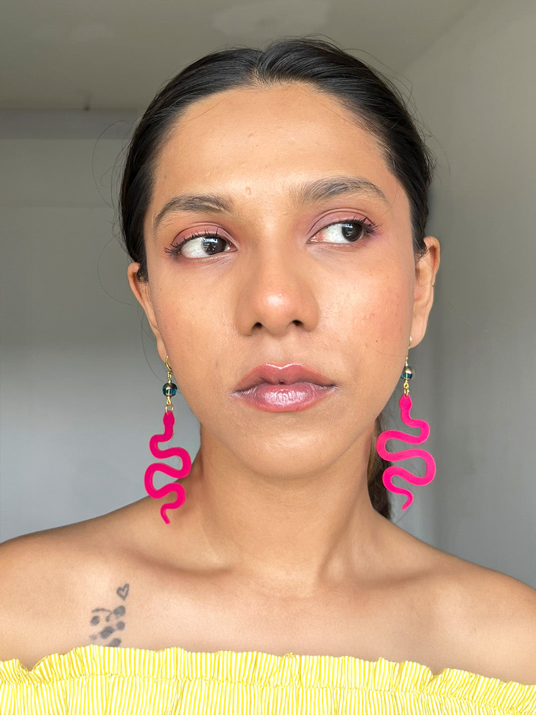 Style: Drop earrings of a curved snake and a sparkling accent bead attached to a hoop clasp.