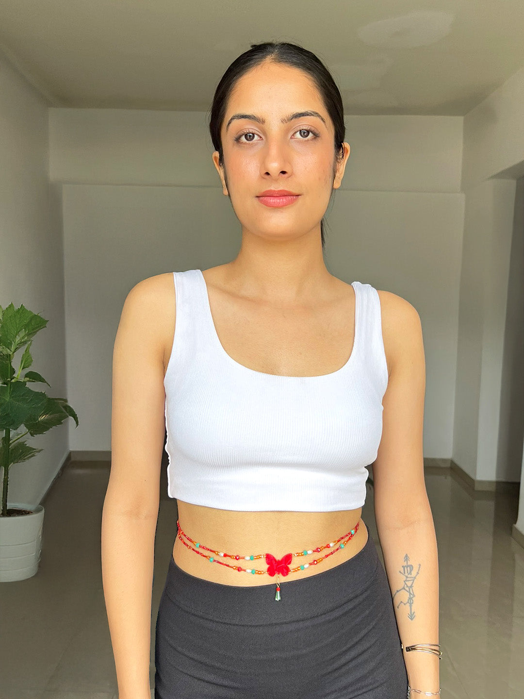 Style: Double-strand butterfly beaded waist chain with a dangling tassel bead. It has a delicate bohemian/fairycore aesthetic with an adjustable clasp.