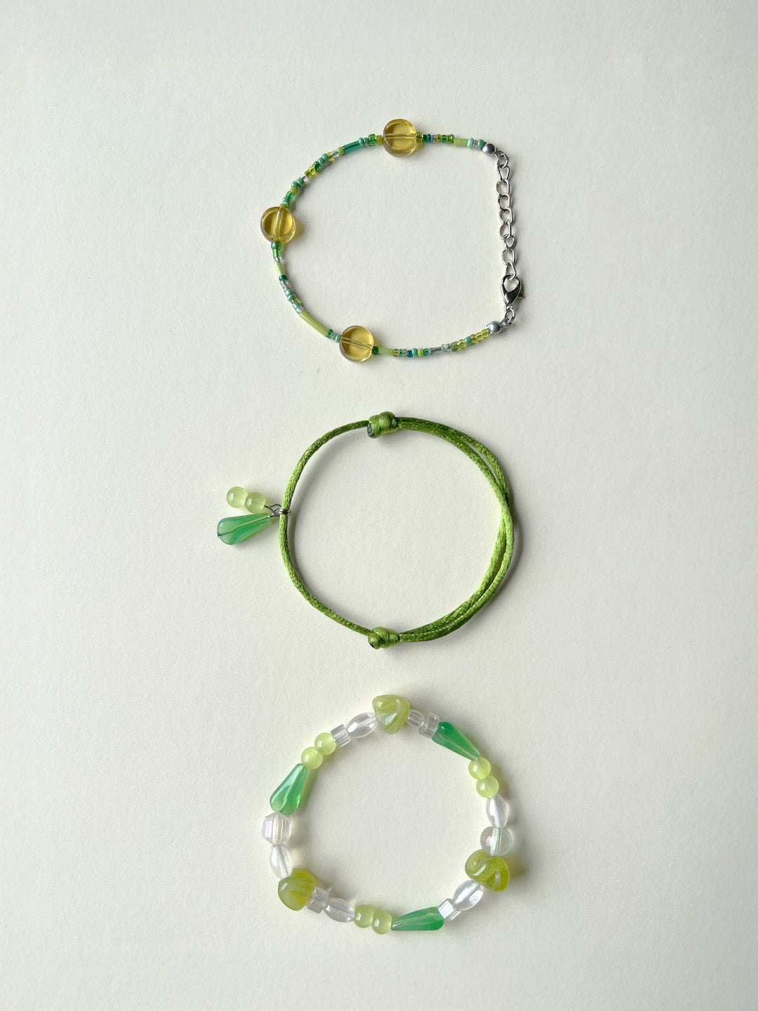 Style: 3 piece stackable bracelet set (1) beaded chain bracelet (2) adjustable cord bracelet with beaded charms (3) chunky beaded stretch bracelet.